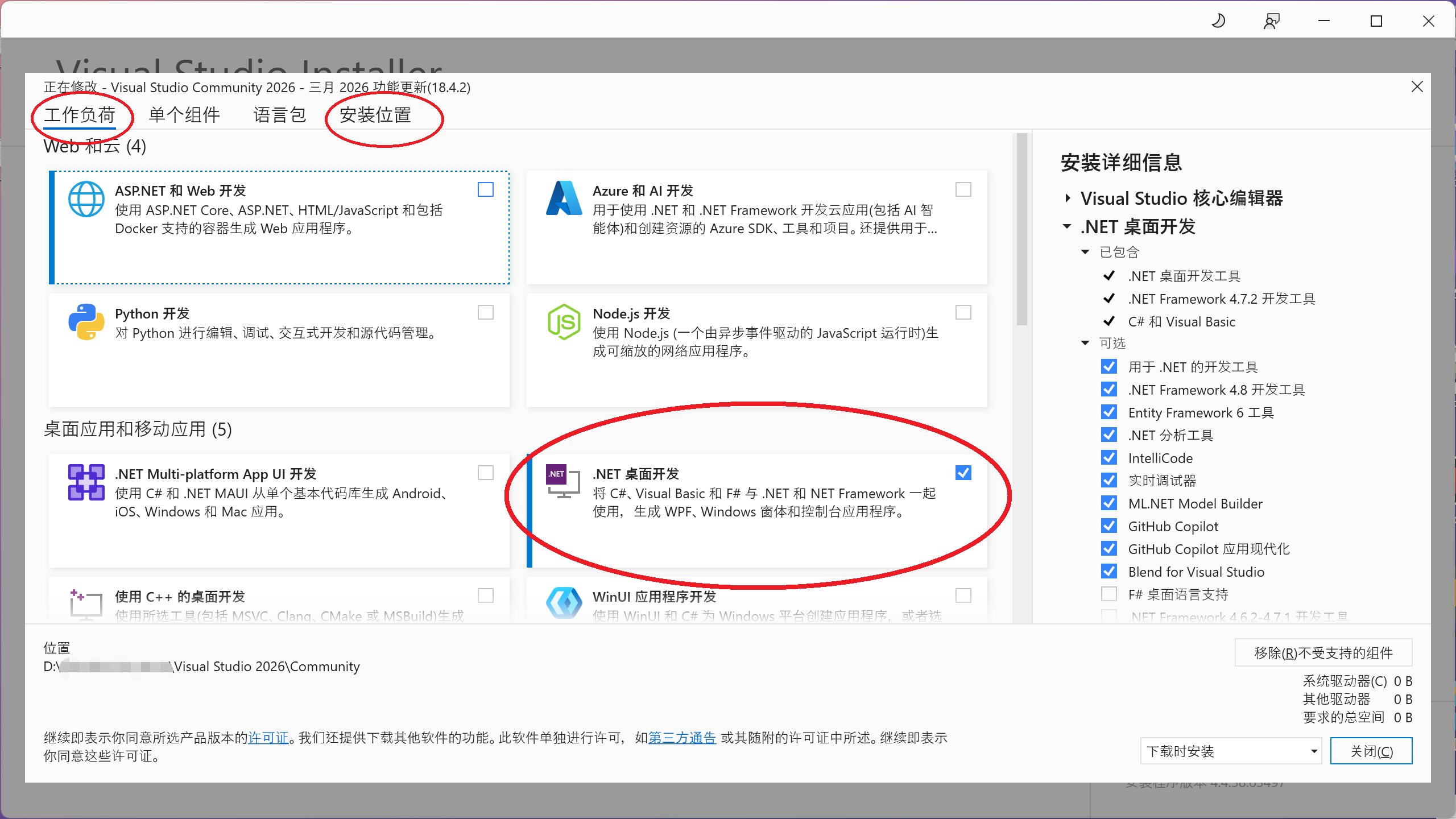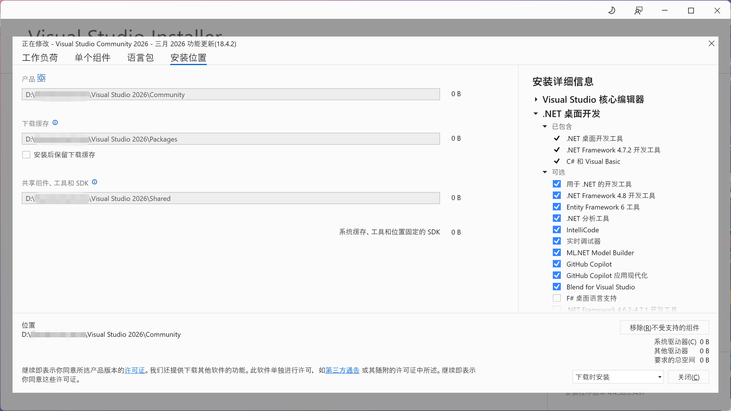 进入https://visualstudio.microsoft.com/ ,下载Visual Studio 2026免费版(即Community版),获得该程序的安装包,安装时,在“工作负荷”中勾选【.NET桌面开发】即可,在“安装位置”中,建议设置如下:如我这里是首先在D盘的新建了Visual Studio 2026文件夹,在这个文件夹内又新建了Community文件夹、Packages文件夹、Shared三个文件夹。然后在安装程序中,将“产品”路径指定为Community文件夹,将“下载缓存”路径指定为Packages文件夹,将“共享组件、工具和SDK”路径指定为Shared文件夹。但要说明的是,即使是这样,该程序仍有一部分内容被强制安装在C盘里,所以需要在“工作负荷”页面确认是否有足够的空间,特别是系统驱动器(C)的空间是否足够。我这里因为已经安装过了,所以不会显示需要多少G的容量。