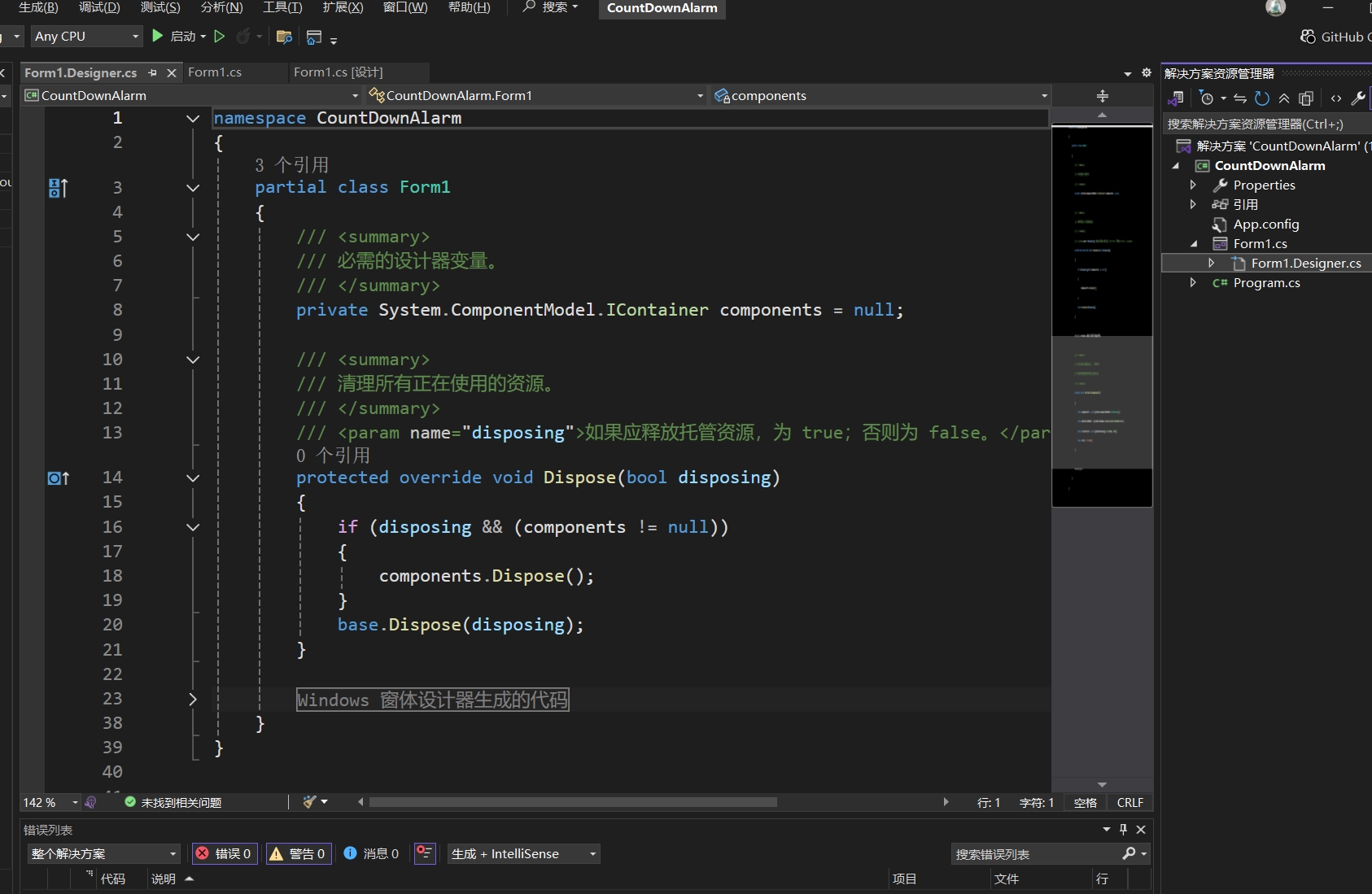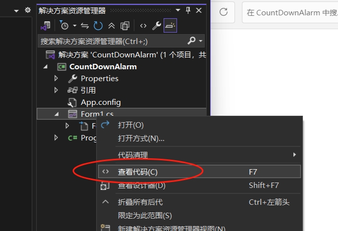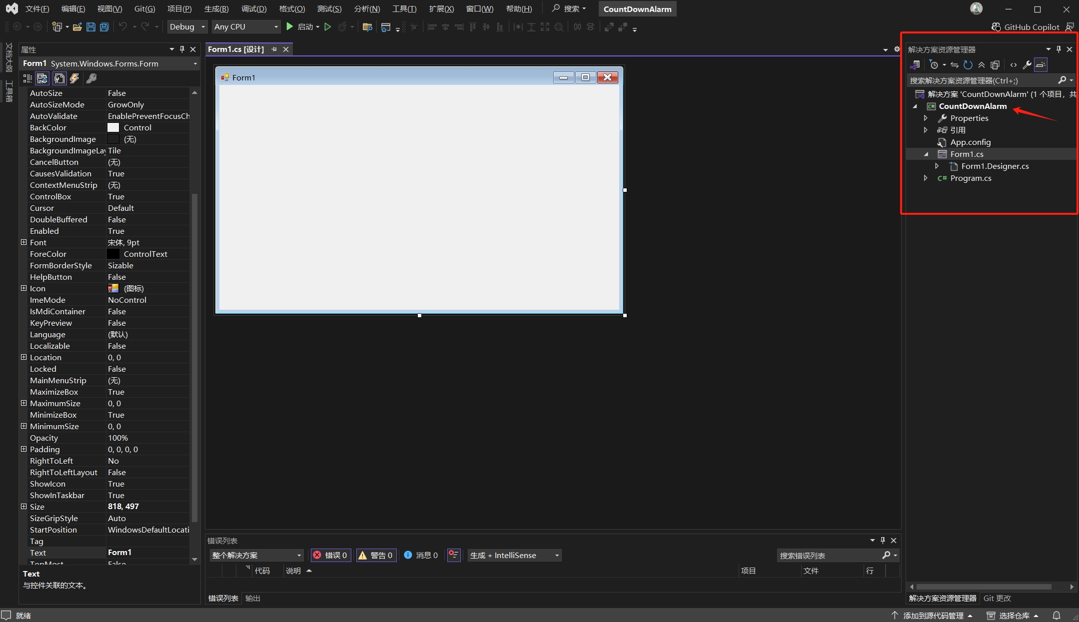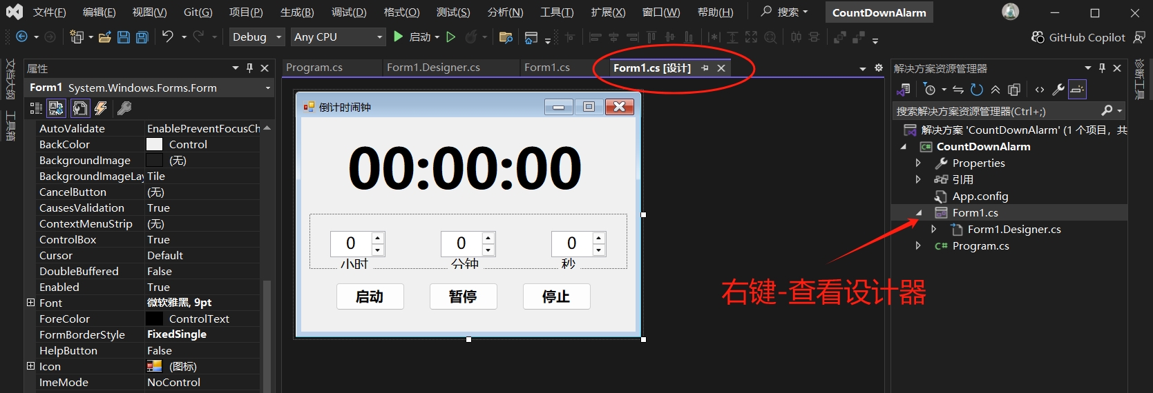 如果你打开的界面和这个长得不太一样甚至区别很大,都没有关系,只需要注意到屏幕右侧的“解决方案资源管理器”,其中有一个名为“CountDownAlarm”的项目,这个就叫做“解决方案”,在VS中这代表整个程序项目。应当注意到这个“CountDownAlarm”的项目之下有三个文件,即: