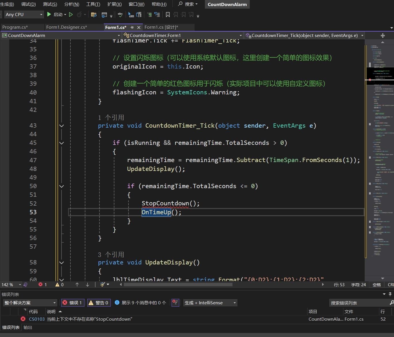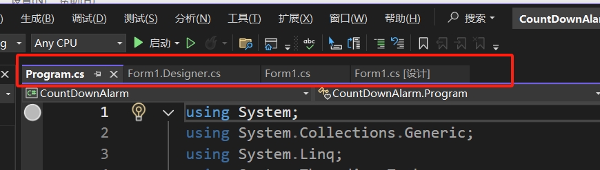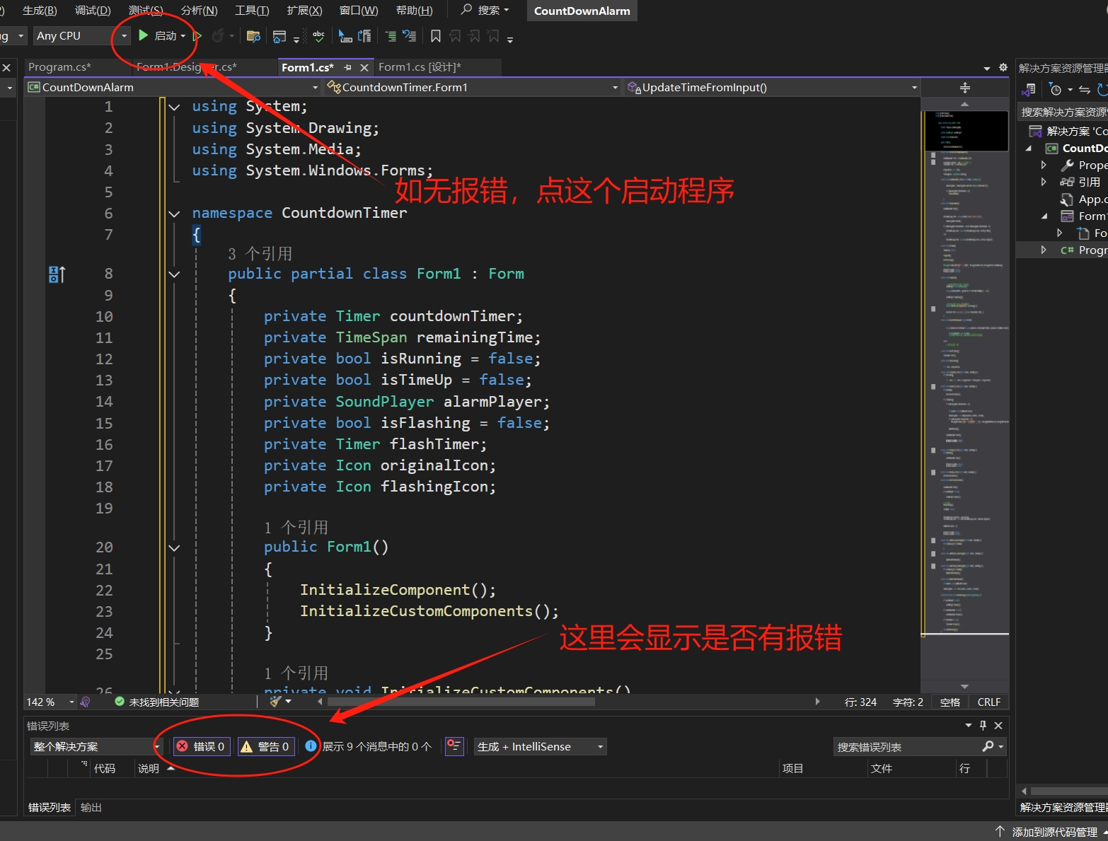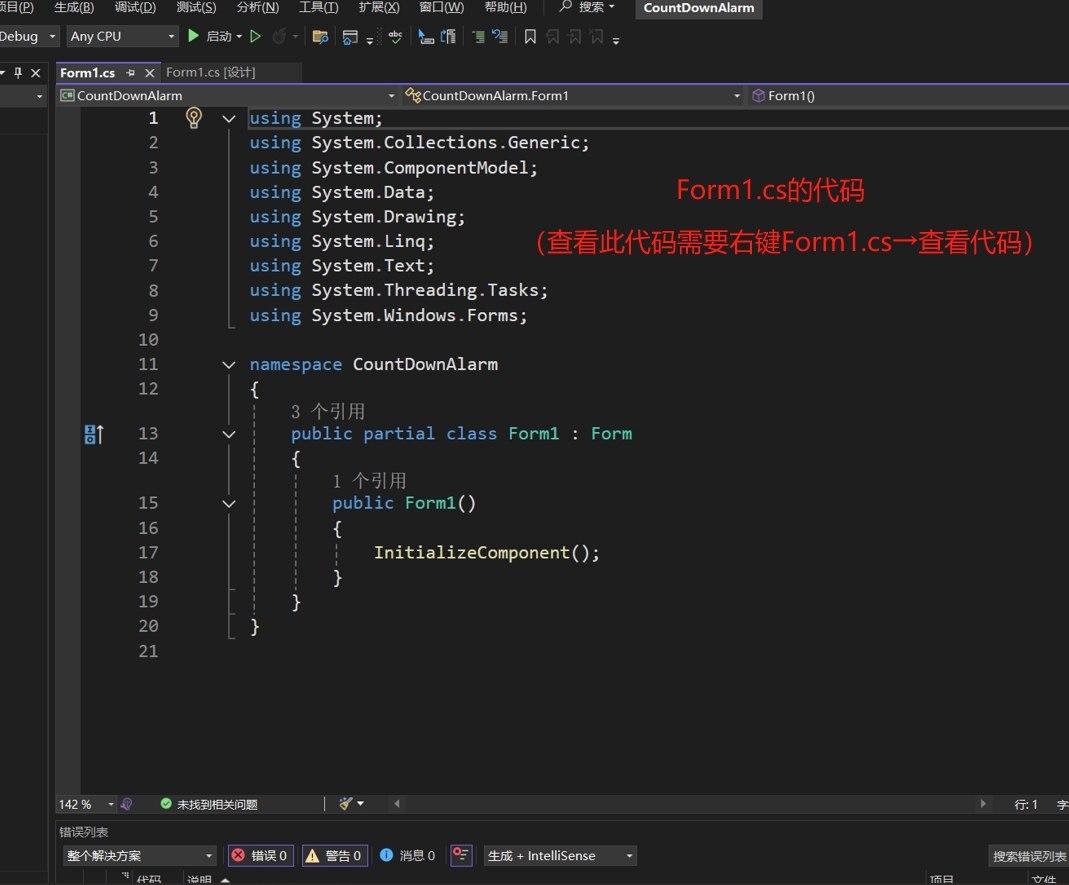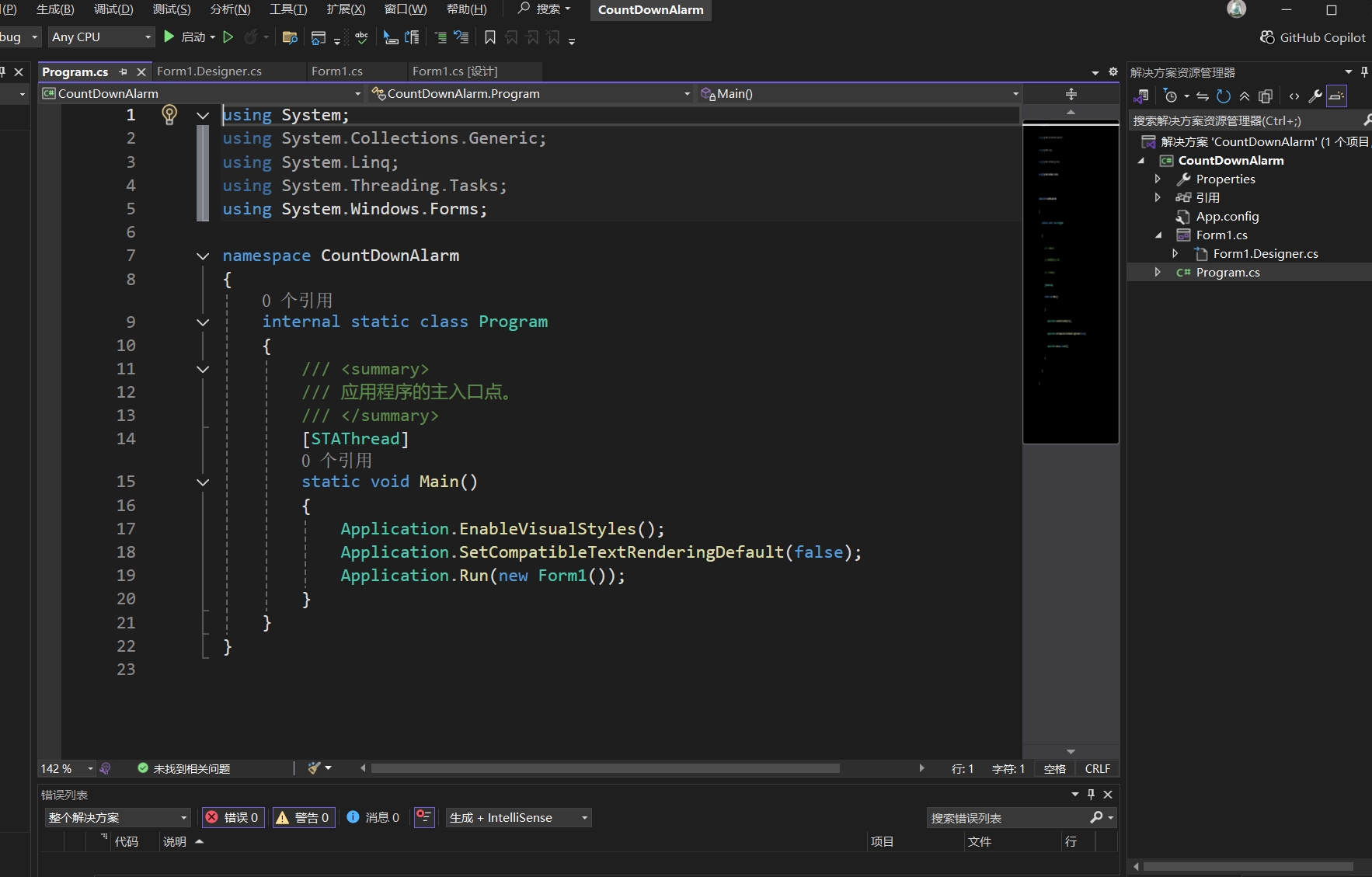 如果你打开的界面和这个长得不太一样甚至区别很大,都没有关系,只需要注意到屏幕右侧的“解决方案资源管理器”,其中有一个名为“CountDownAlarm”的项目,这个就叫做“解决方案”,在VS中这代表整个程序项目。应当注意到这个“CountDownAlarm”的项目之下有三个文件,即:
