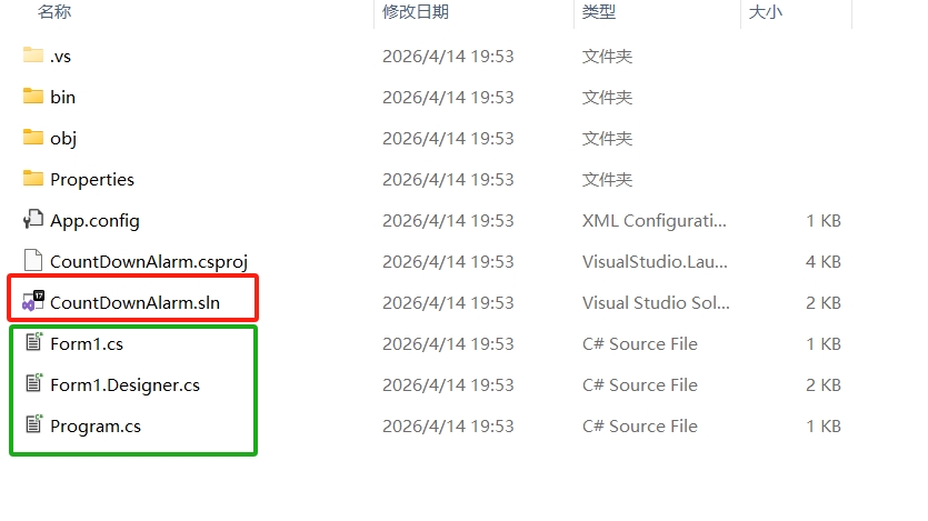 我们这里再打开D盘根目录下的NewForm文件夹,查看一下这些文件是怎么存储在硬盘上的。可以看到,文件的目录结构和我们在VS中观察到的类似,也能看到这三个文件(绿框中的三个文件),红框中的文件名为CountDownAlarm.sln,此为解决方案文件,可以尝试双击这个文件,如果提示选择打开方式的话就选择我们刚装的Visual Studio应用程序,应该是能够直接打开该项目的。当然我们也可以先打开VS→打开项目或解决方案,再找到CountDownAlarm.sln的位置,也可以重新打开该项目。