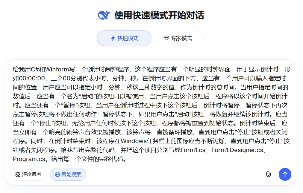 本次将使用免费的AI大模型Deepseek完成代码的编写,Deepseek的使用较为简单,我们只需要打开www.deepseek.com/ ,即可进入Deepseek官网,登录账号进入对话界面后即可使用,对话只需要使用“快速模式”,不需要使用“专家模式”(这可能会在未来变成收费项目);“深度思考”酌情开启,我们本次均不开启。AI的使用相当无脑简单,一句话说,就是写让人能看懂的汉语小作文,要点是必须提到关键性词语,例如用何种计算机语言、何种框架来实现,就必须明确提到这个语言和框架的准确词语。语句要使用书面语,避免口语化,尽最大可能不出现歧义。