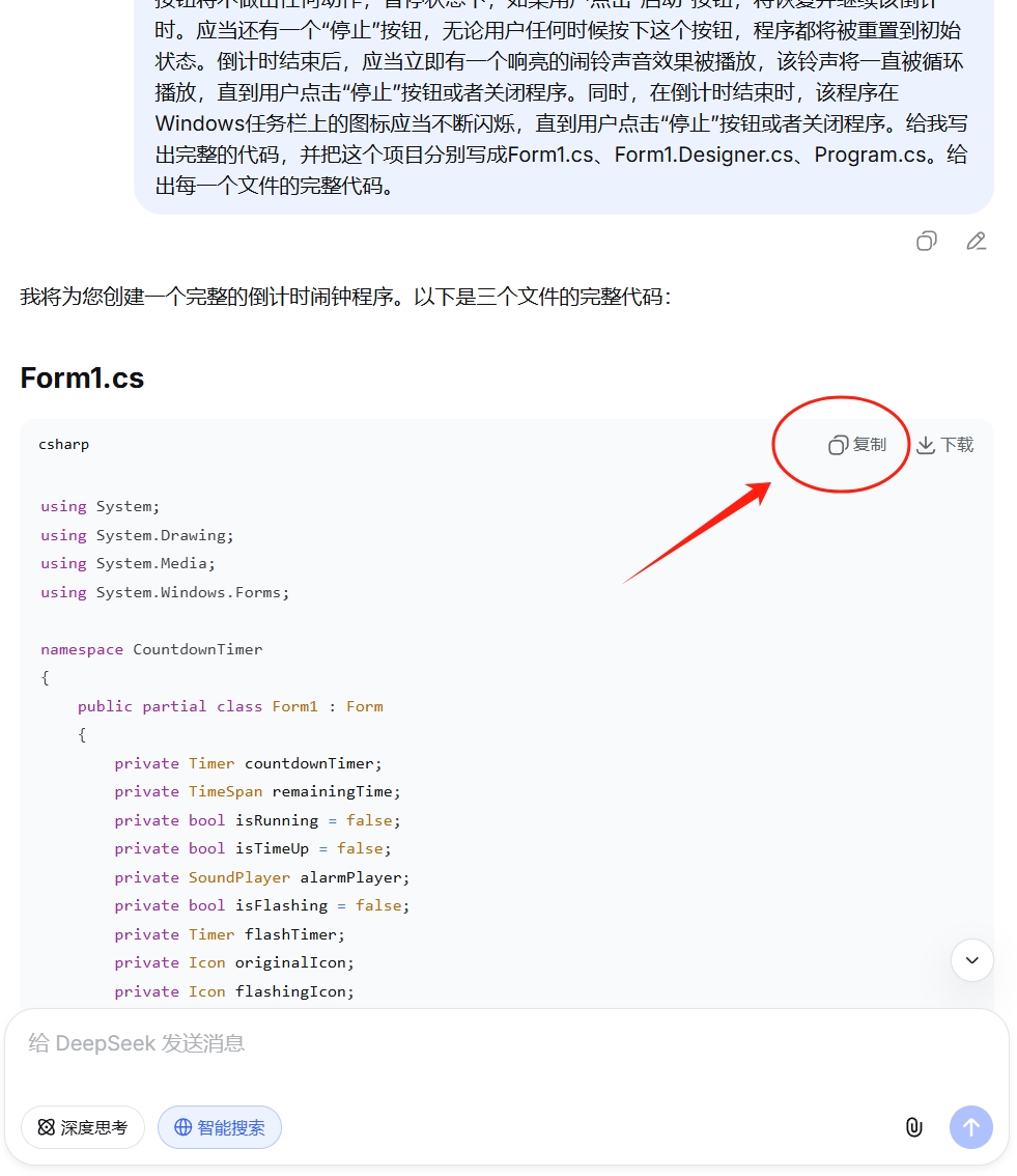 点击他代码框右上角的“复制”按钮,即可复制整块代码,我们需要将三块代码(Form1.cs、Form1.Designer.cs、Program.cs)分别复制进VS里的对应的文件里,覆盖掉原有的默认代码,注意一定要对号入座,不要复制错了。