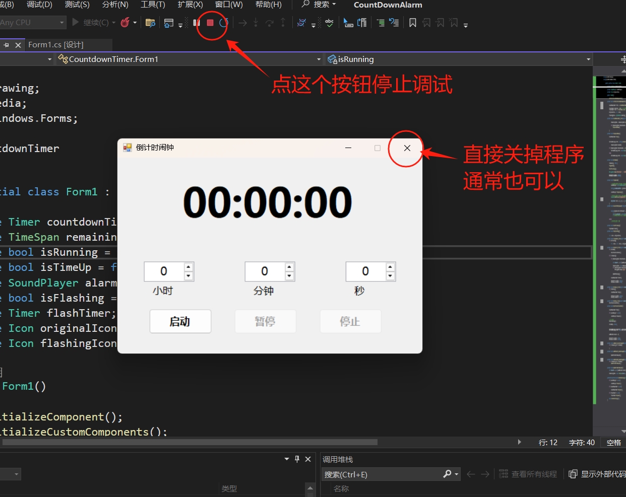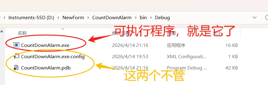 只要我们在VS中用“启动”按钮编译过这个程序后,程序就将在解决方案的目录下生成这个最后一次正确编译的可执行程序文件。这个目录现在应当是D:\NewForm\CountDownAlarm\bin\Debug,在这个目录中我们能看到一个叫CountDownAlarm.exe的可执行程序,这就是造出来的程序了,我们可以将它复制到任何地方,理论上都是可以直接运行的。
