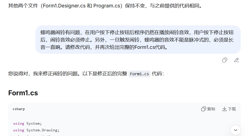 现在我们来造这个程序。这个程序的目的是为了实现倒计时提醒的功能,可以设想一个使用场景:例如我现在在电脑上看电视剧(很入迷),但是打算在3分钟后准时喝一口水,那么为了在三分钟后准时喝到水,就必须有一个闹钟来打断我被电视剧吸引住的状态。故我们可以用一个倒计时提醒的软件来实现这个功能。我们可以设想一下该软件的使用细节,并让AI生成代码,小作文可以如下: