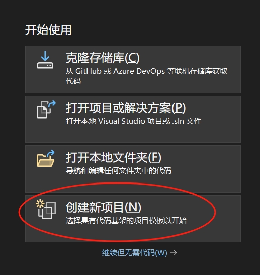 安装完VS以后,启动它。我写这段的时候是在旧设备上写的,这个设备安装的是VS2022,所以这里我将以VS2022的界面来演示,基本上是完全相同的。