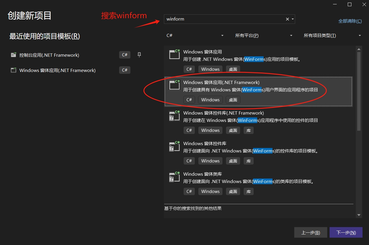 首先点击【创建新项目】,然后会看到很多项目模板,这里我们选择【Windows窗体应用(.NET Framework)】这一选项,如果找不到,在上方搜索框搜索Winform即可找到。然后点击下一步。