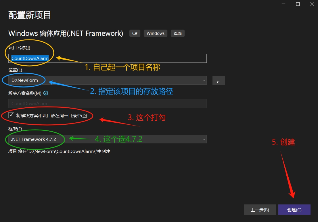 在这个界面按照下图内容操作即可。主要是指定项目名称和项目存放路径,这里我是在D盘根目录新建了一个“NewForm”的文件夹存放这些程序的项目,当然你可以自己指定一个目录。因为我们第一个程序叫做“倒计时闹钟”,故这里的项目名称就叫做CountDownAlarm。点击创建。